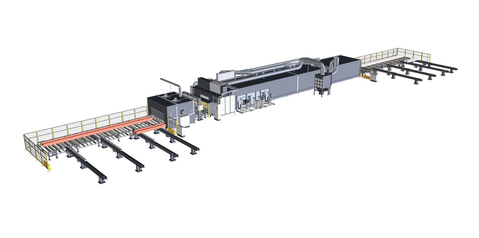 Die Bearbeitung des Materials in der Lackieranlage erfolgt automatisch: z.B. Reinigen mit ionisierter Luft, Lackieren, Trocknen und Kühlen.